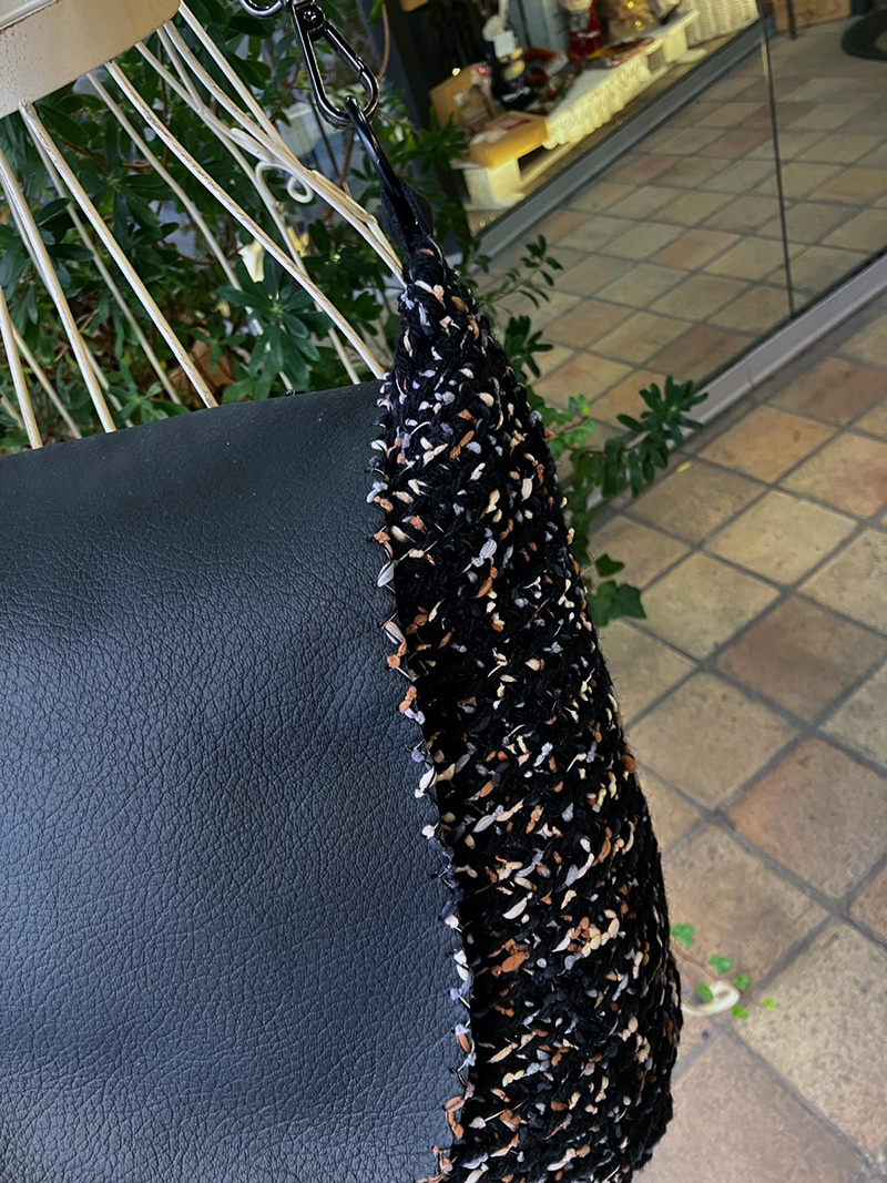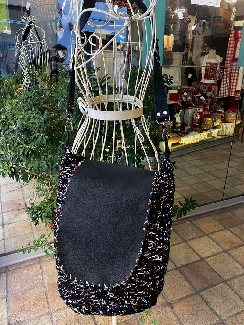 Borsa a secchiello in filato di pura lana, interamente foderata con tasca interna, patta e manico a tracolla in pelle. Fatta a mano a tricot e pezzo unico. Spedizione gratuita.