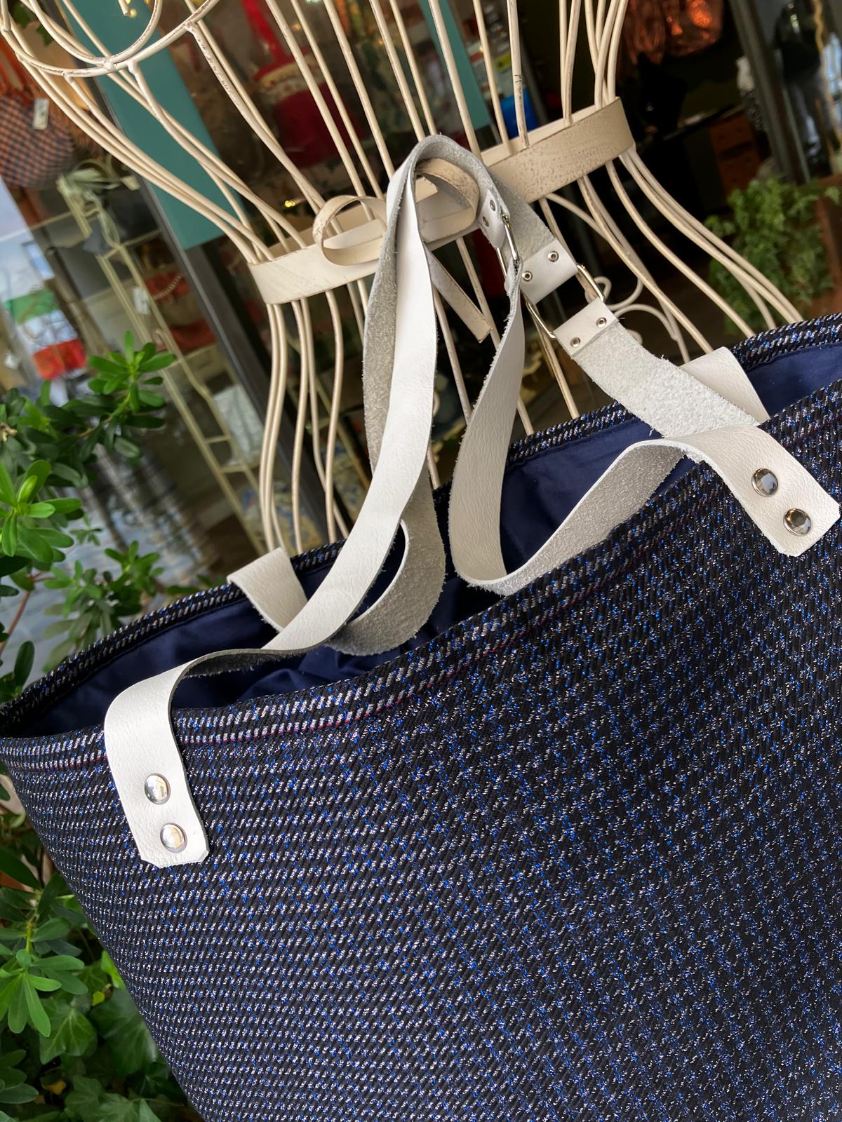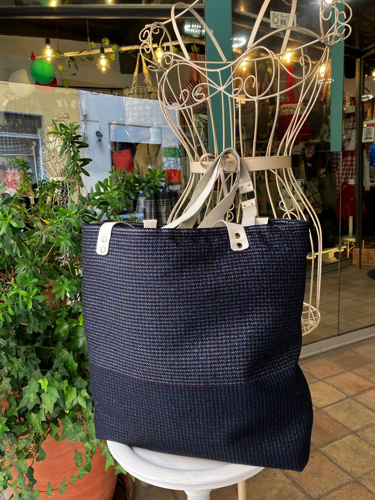 Borsa in tessuto di lana, interamente foderata con tasca interna, chiusura a secchiello, manici a spalla in pelle.