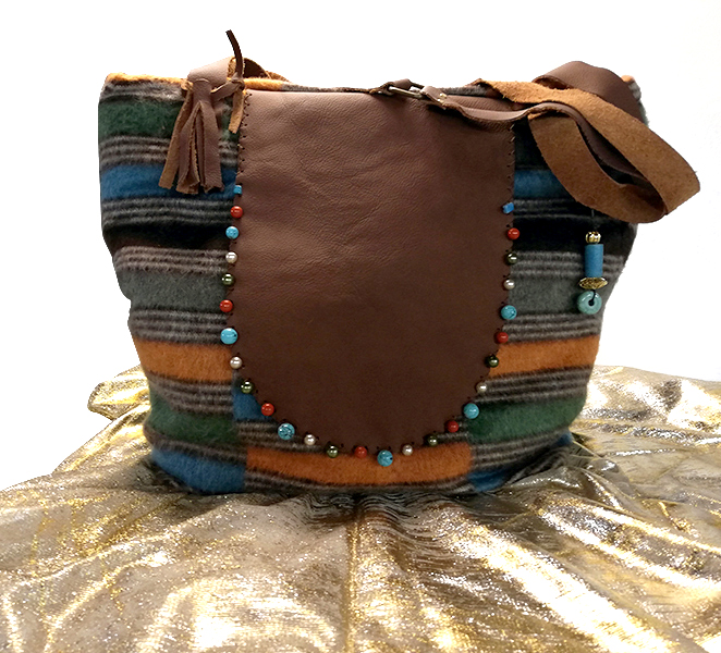 Maxi bag in tessuto di pura lana, interamente foderata con tasca interna, chiusura a secchiello e manici a spalla in pelle e ciondoli in pietre dure. Interamente fatta a mano.