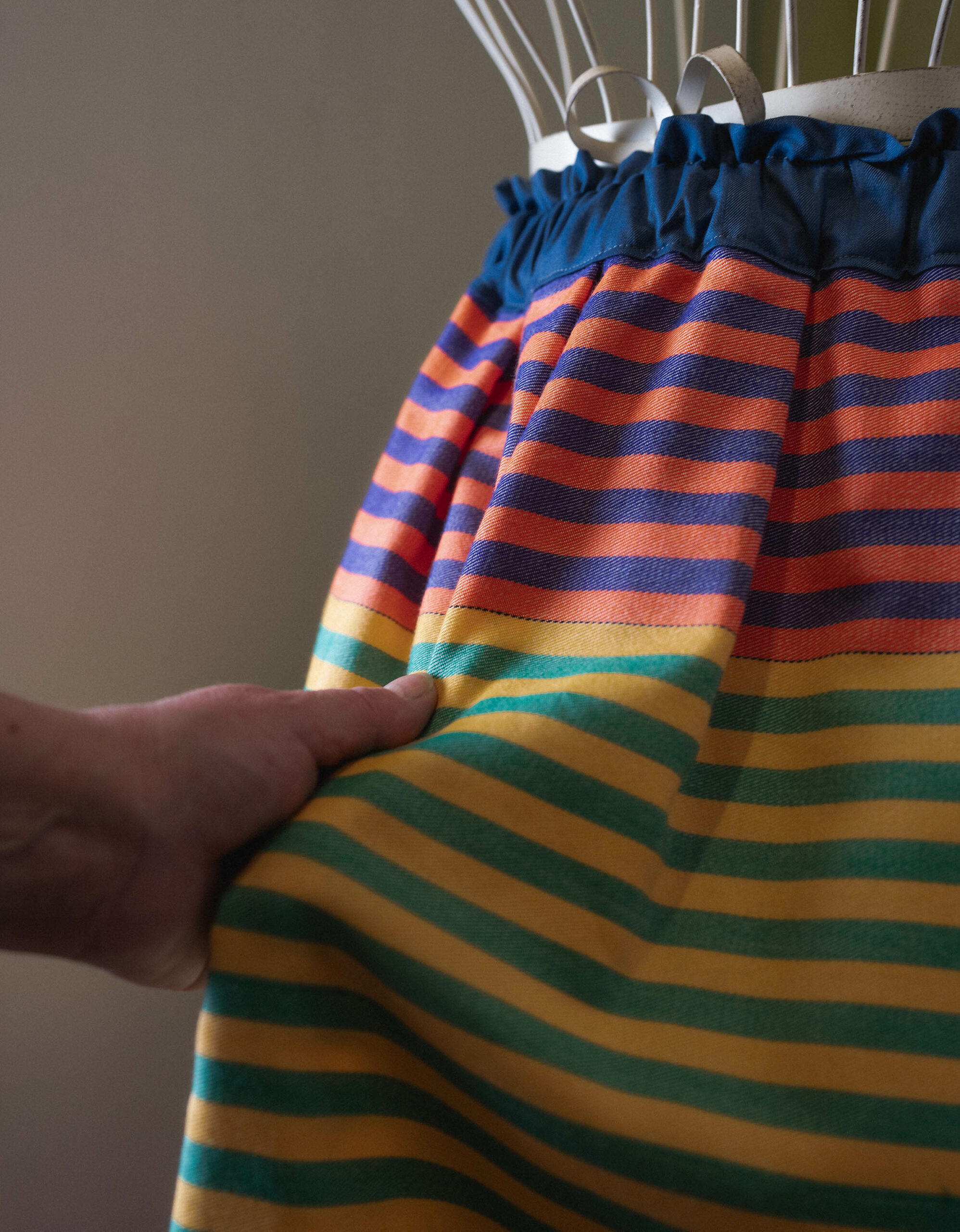 Gonna in leggero tessuto di pura lana, fascia con elastico in vita, circonf. max cm. 102 lungh. cm. 72. Pezzo unico. Spedizione gratuita.