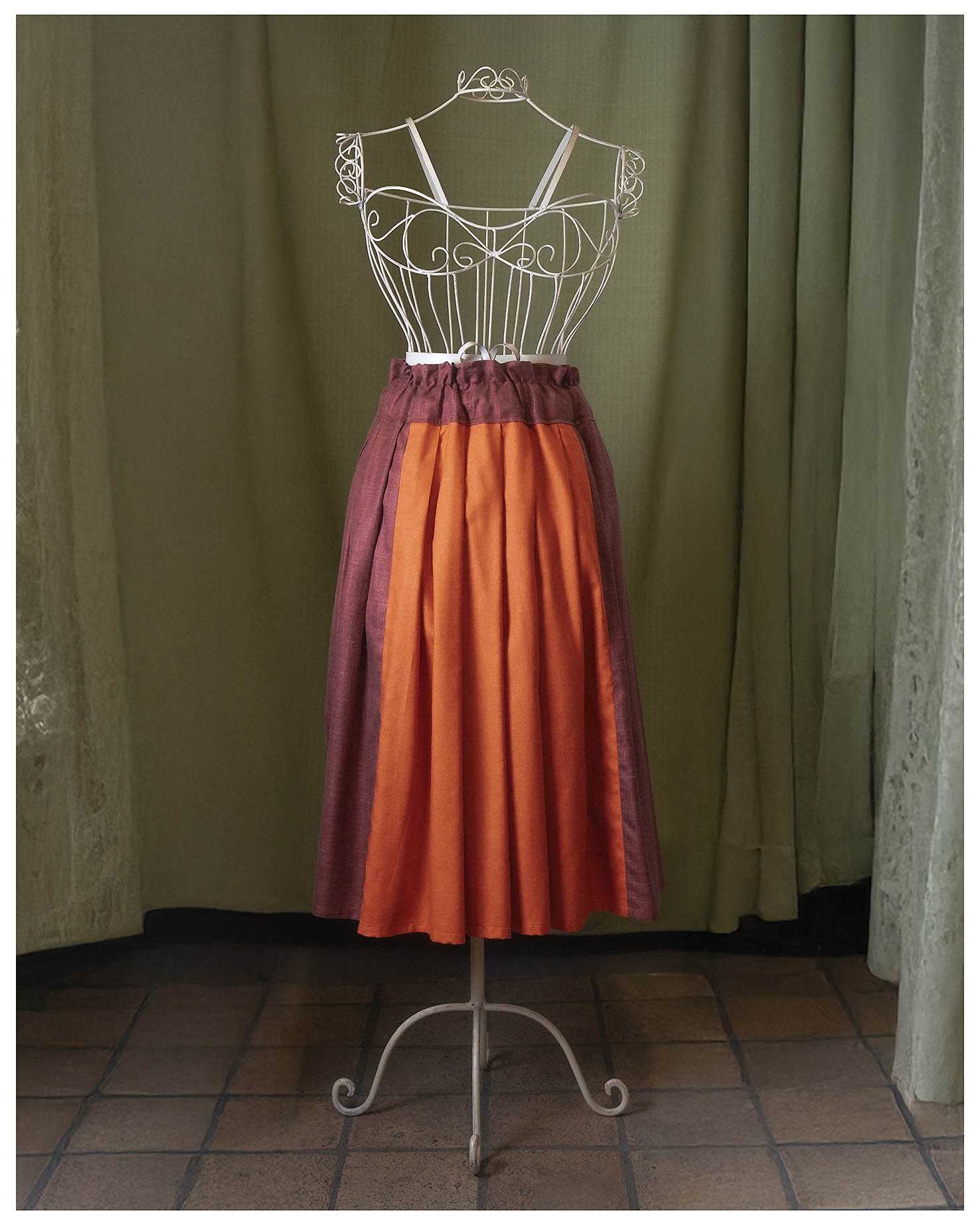 Gonna a teli due colori in tessuto puro cachemire e seta, fascia con elastico in vita, circonf. max cm. 102 lungh. cm 72. Pezzo unico. Spedizione gratuita.