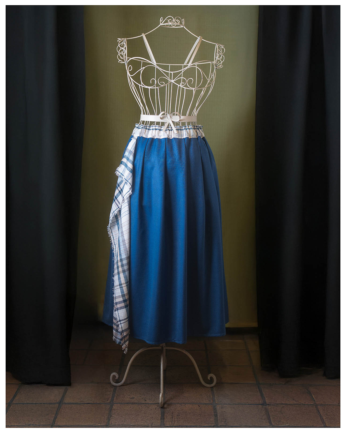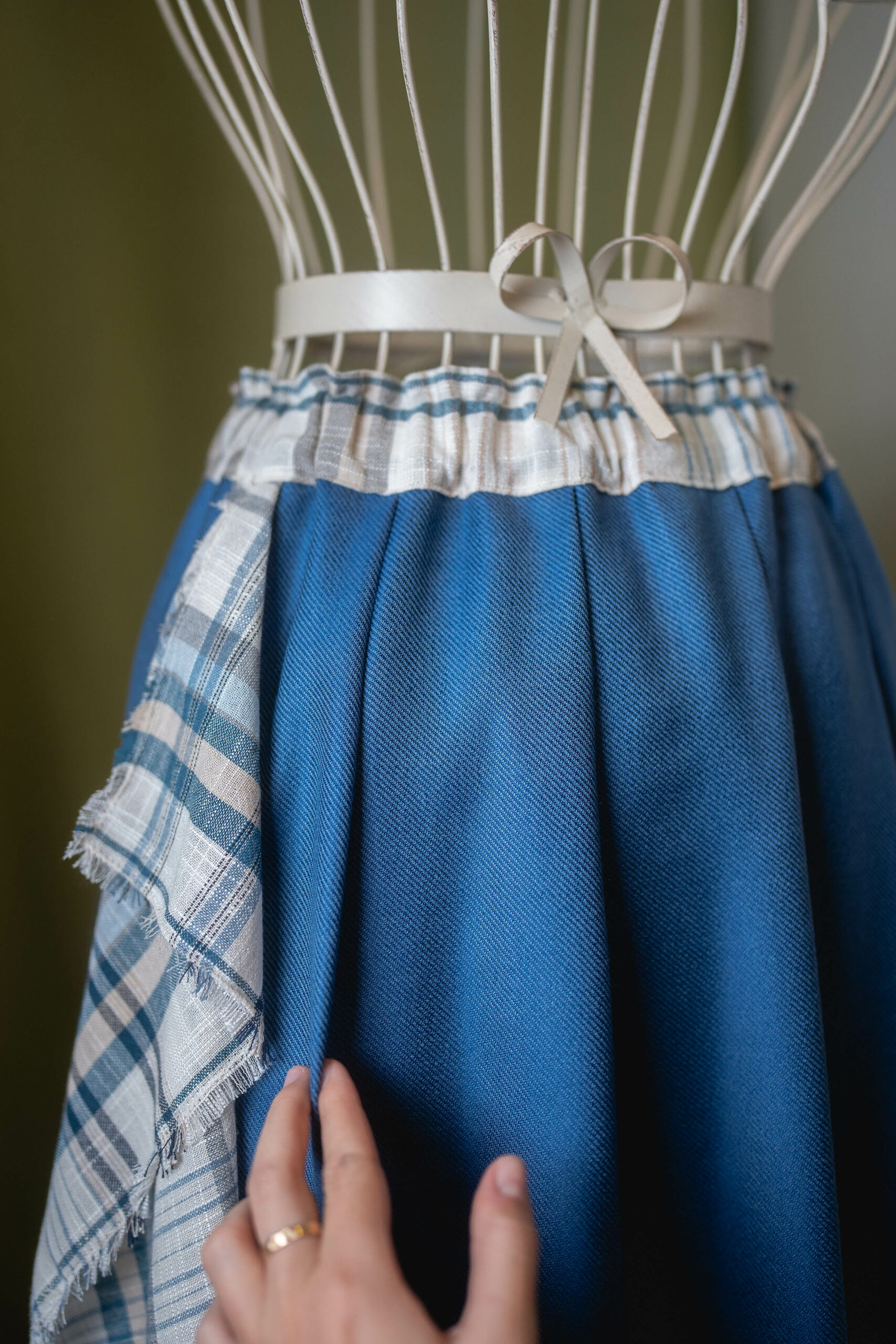 Gonna in tessuto di puro cachemire con balza laterale in lino e cotone, fascia con elastico in vita circonf. max cm 102 lungh. cm. 77. Pezzo unico. Spedizione gratuita.