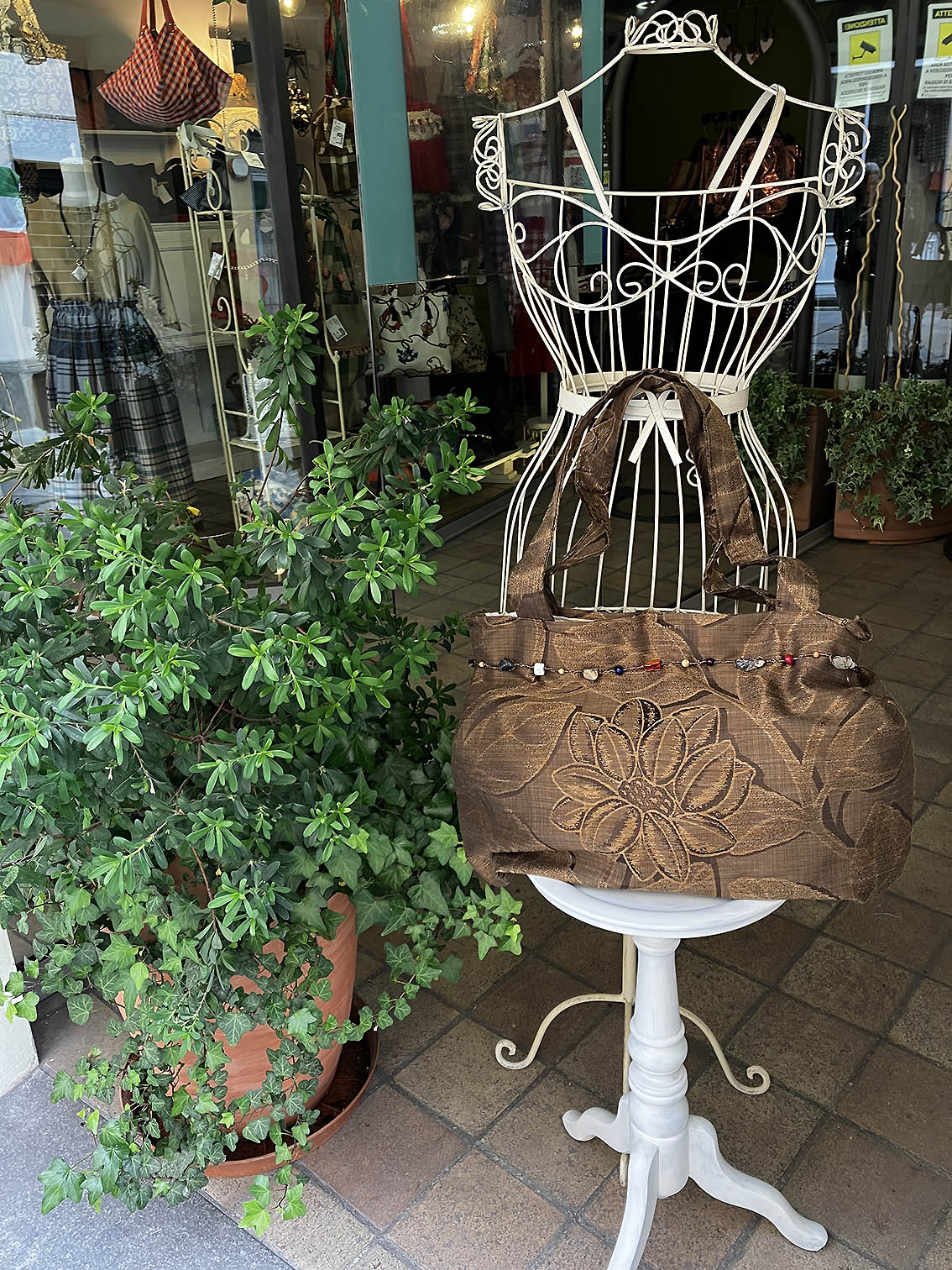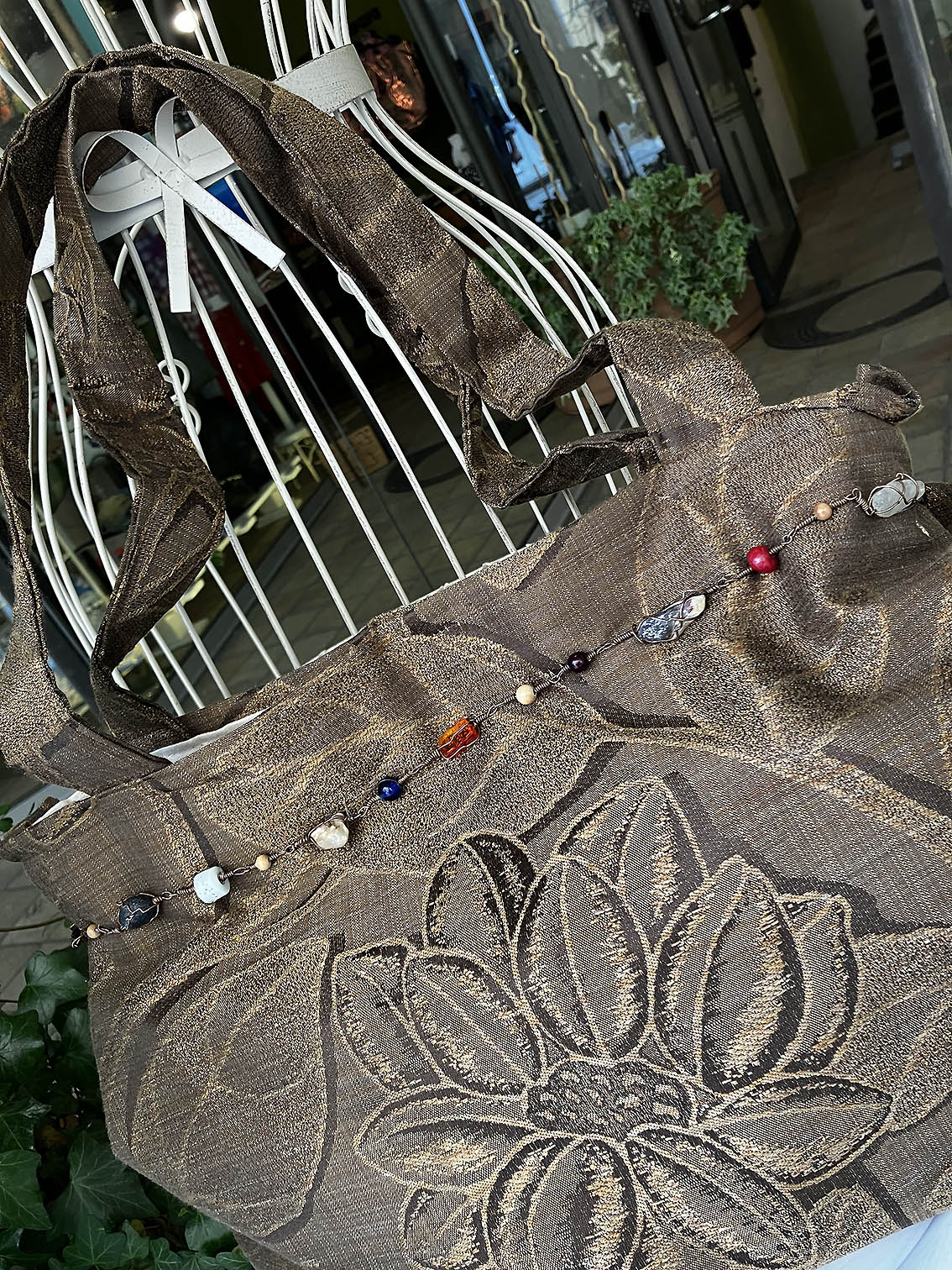 BORSA IN TESSUTO DAMASCATO, APPLICAZIONE DI PERLINE COLORATE, INTERAMENTE FODERATA CON TASCA INTERNA, CHIUSURA CON CERNIERA, DUE MANICI A SPALLA. INTERAMENTE ESEGUITA A MANO.