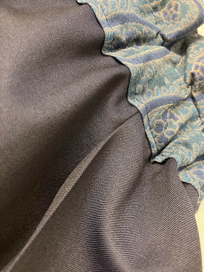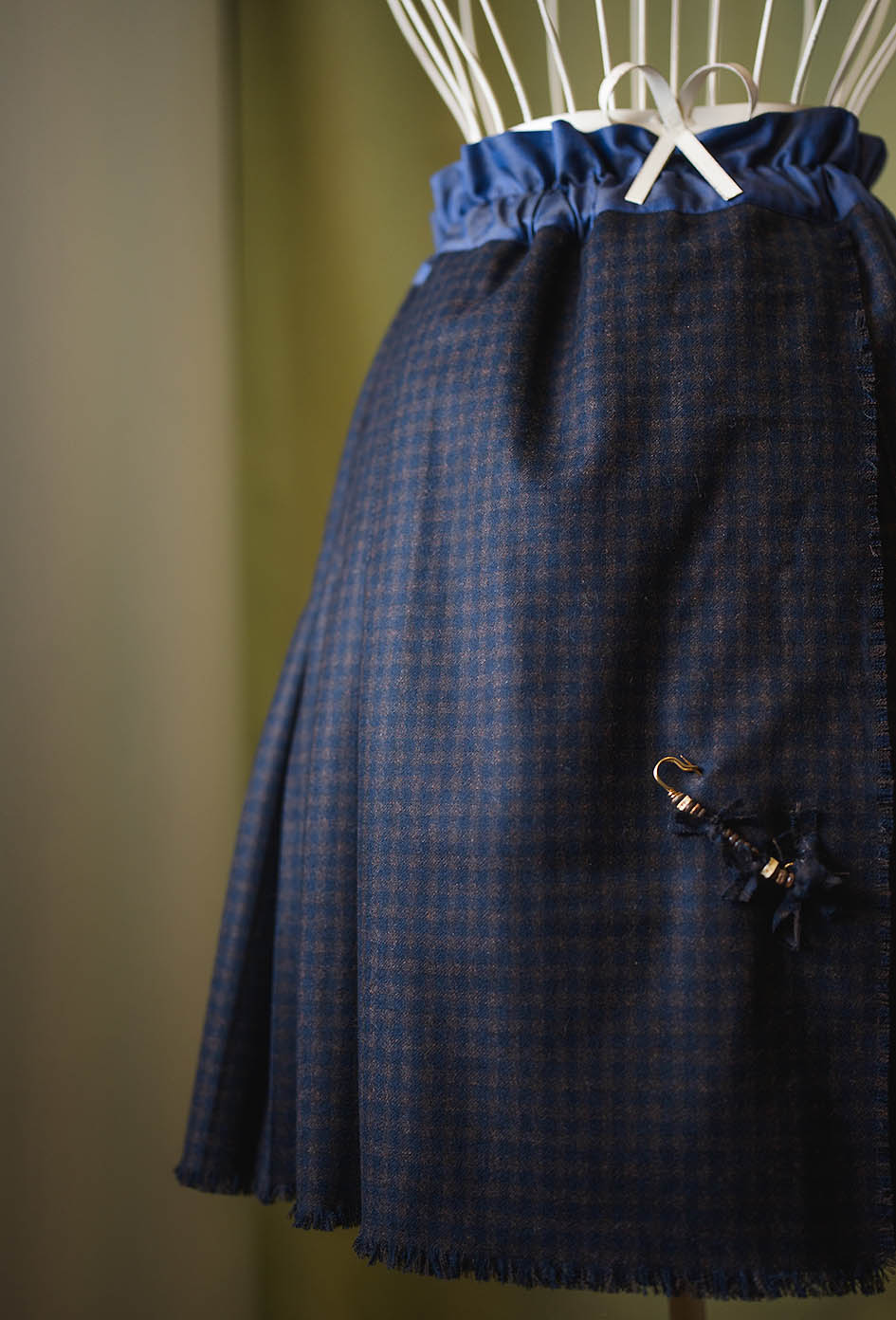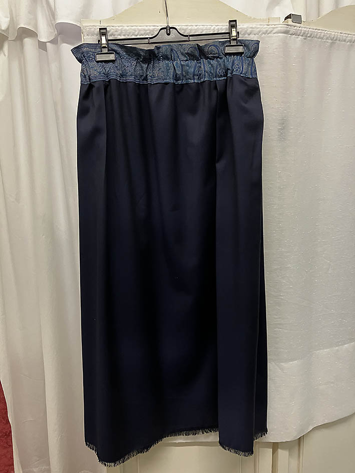 GONNA IN TESSUTO DI FRESCO LANA BIELLESE, COLORE BLU, FASCIA CON ELASTICO IN VITA IN FANTASIA CASHMERE, TG.S/M, LARGH. MAX GIROVITA CM. 98, LUNGH. CM. 84, ORLO SFRANGIATO. INTERAMENTE ESEGUITA A MANO.