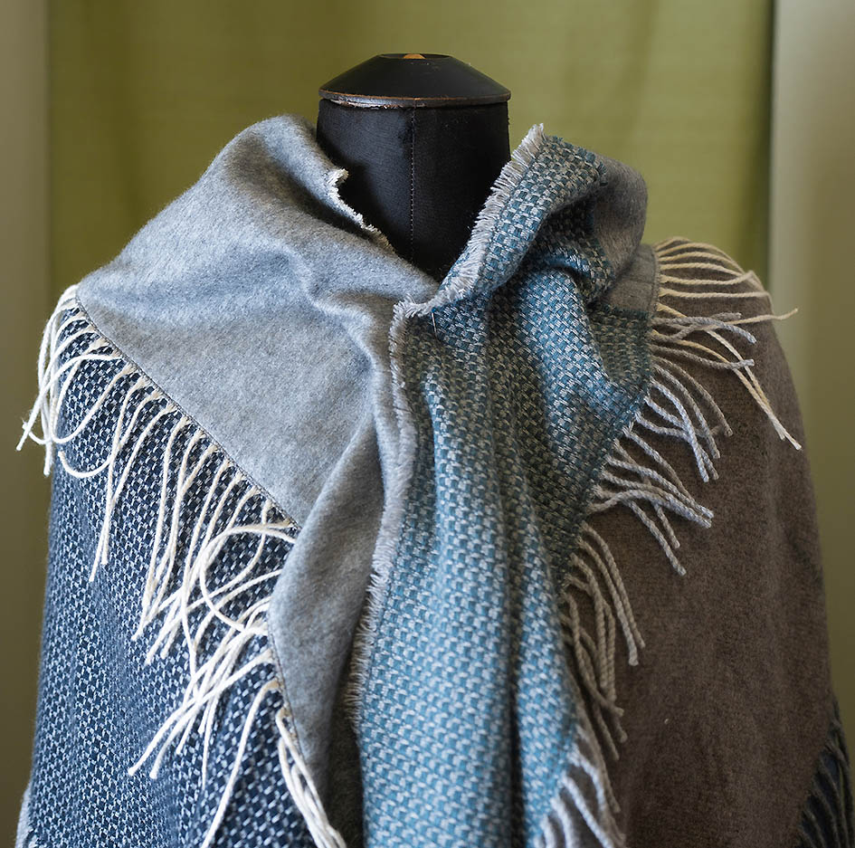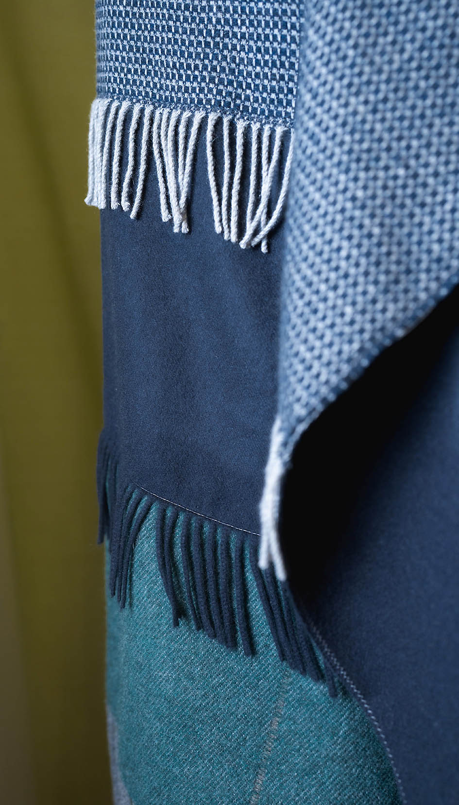 MANTELLA IN MORBIDO TESSUTO PURO CASHMERE DEL TERRITORIO BIELLESE, LAVORAZIONE PATCHWORK, COLORE NEI TONI DEL BLU/VERDE OTTANIO/GRIGIO/AZZURRO/LILLA, MISURA LARGH. CM. 180, LUNGH. CM. 90, INTERAMENTE ESEGUITA A MANO.